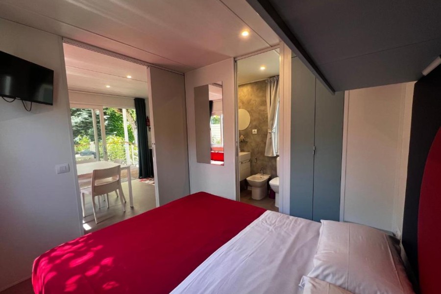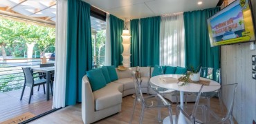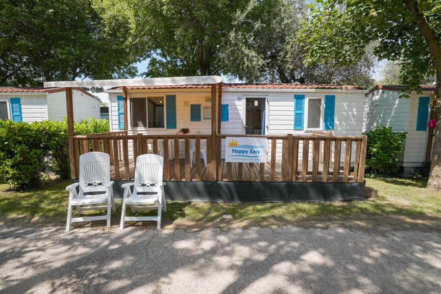 All'interno del Camping Riccione è presente un'unica soluzione di case mobili ideale per chi cerca libertà, relax insieme al divertimento e lo svago di un Camping Village. La Casa Mobile Happy con una superficie di 24 mq, può ospitare fino a *5 adulti e 1 bambino (di età max. di 12 anni) ed è composta da una stanza matrimoniale, una stanza con due letti singoli più un letto supplementare a parete, perfetto per un bambino di massimo 150 cm di altezza e 60 kg di peso. Il soggiorno offre un ulteriore posto letto grazie alla seduta con cuscini, posizionata attorno al tavolo da pranzo. Completano l'interno una cucina accessoriata, un bagno con wc, doccia e lavandino. La Happy Easy è dotata di uno spazio esterno attrezzato con un tavolo con sedie da giardino e due sdraio o sedie reclinabili. Ove il campeggio lo permette, è disponibile una piastra elettrica per grigliate all'aperto. Le Pulizie finali devono essere effettuate dal cliente, altrimenti verranno trattenuti dalla cauzione € 40,00 per Happy Easy. Per prenotazioni con gruppi di ragazzi (tra i 18 e i 25 anni) si prega di segnalarlo nella sezione "hai esigenze particolari" in fase di conferma online.
