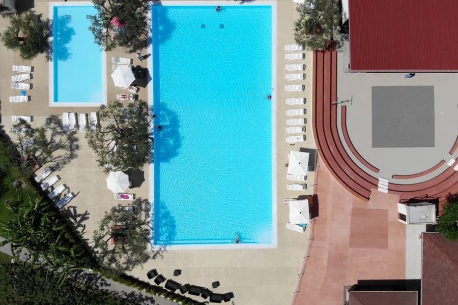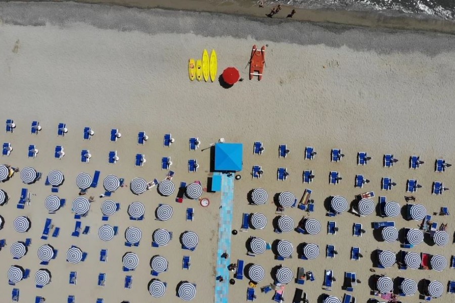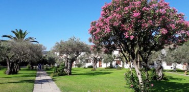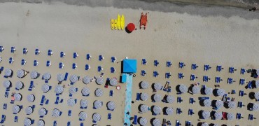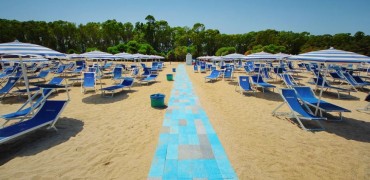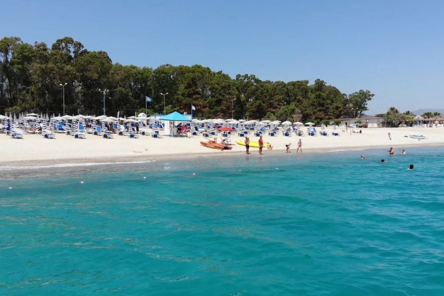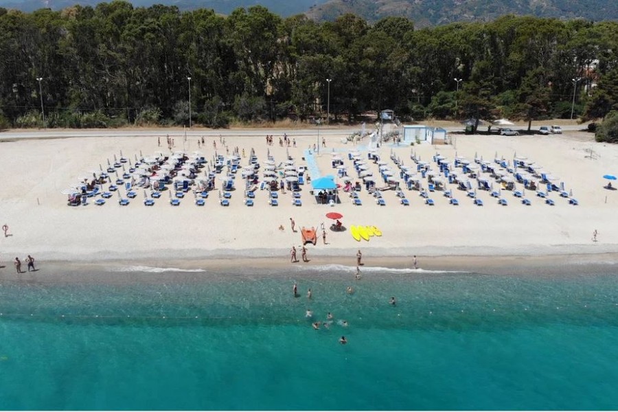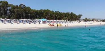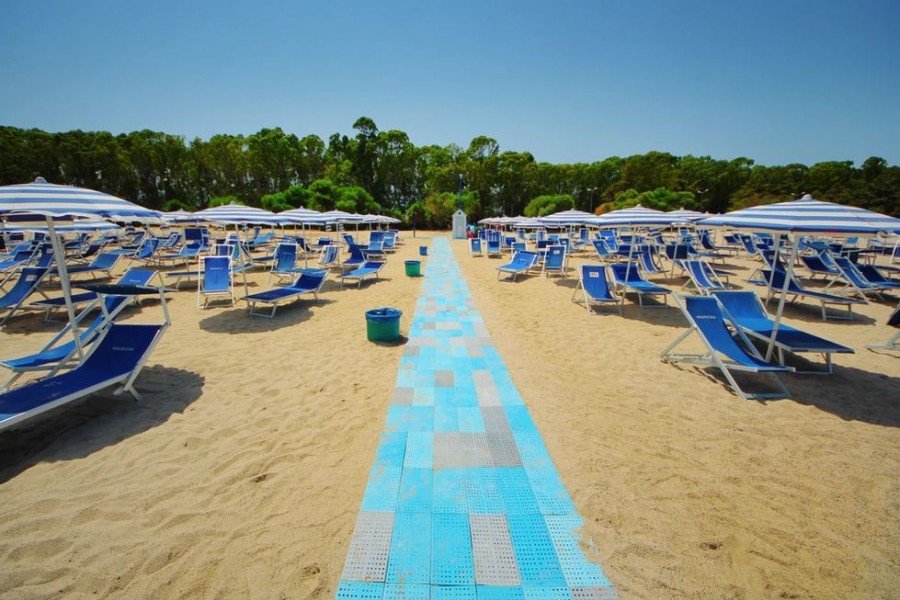 La spiaggia del Nausicaa Village di fronte al villaggio, con attraversamento del lungomare, ampia e di sabbia bianca, attrezzata con 1 ombrellone, 1 sdraio ed 1 lettino assegnato per camera per tutto il giorno, docce, servizi, spogliatoio ed infermeria. Battigia di sabbia misto a piccoli ciottoli. Prima e seconda fila con supplemento fino ad esaurimento e con un noleggio di 2 teli mare a camera a soggiorno inclusi (cambio extra a pagamento). Noleggio teli mare (con cauzione).